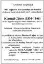 Röviden magyarul: nemes Szlanikoviczi Klauzál Gábor, Schmidt Emma férje, Pesten született, Kalocsa 15. szám alatt halt meg tüdőgyulladásban, 62 éves férfi. Halála előtt nem gyónt, de felvette az utolsó kenetet. A holttestet Nehiba János fölszentelt Tinnini püspök áldása után a családi kriptába, Szegedre szállították.