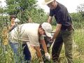 Az első lépés, a kisebb telepekben vagy magányosan kimagasló, embermagasságú gazok eltávolítása volt. Némely izmosabb, 10–15 vastag szárat növesztett példány kihúzgálásához négy meglett férfi ereje is elkelt. Külön harcot kellett vívni a kesztyűt is átbökő, szintén felettébb szívós mezei aszattal. A hatalmas gyomok tövében már megjelent a parlagfű is. E munkafázisban nagy segítséget jelentettek a legifjabb résztvevők: az Avanti Bé-Bé:) és Dénes, akik ásóval, kapával harcoltak és szorgalmasan hordták a kiszedett gyomokat a bejárat mellett egyre terebélyesedő kupacra.