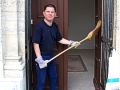 Elnökünk, Dobos Károly a kápolna belsőt vette kezelésbe. Alapos pókhálózás és portalanítás után seprés következett. Pollenek kint, szálló por bent, az érzékenyebbek tüsszögése adta a taktust a munkálkodóknak.