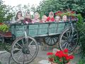 Nem lesz gázáremelés! – ordította a mikrofonba döngölő zene hangjai mellett egy ismeretlen, amikor megérkeztünk. A kerti koncert épp tetőfokára hágott, talán ez csalta ki a fellépőből a meghökkentő gazdaságpolitikai deklarációt – mi mindenesetre az egyelőre csendesebb, tágas ebédlőt választottuk. Itt már gyülekeztek a klauzálosok, egyesek tarhonyás marhapörkölttel, mások musttal, borral felszerelkezve telepedtek le a számunkra foglalt asztal mellé. Kiderült, jó ötlet volt, hogy a legifjabb családosok gyerkőceiket is elhozták, mivel így a házastársak egyszerre felvonulhattak, senki sem kényszerült otthoni pesztrálásra, másrészt a porontyok is kiválóan feltalálták magukat. Először a sétány melletti díszszekeret (1. kép) szállták meg, aztán időről időre csapatostul eltűntek a szőlőtőkék sűrűjében. Későbbi elbeszéléseik szerint ott a Százarcú Boszorkány (2. kép) és más rémségek felkutatására szerveztek expedíciót és „tejfelezést” (3. kép), szerencsére a fegyverként felragadott lőcsök, fakardok és husángok végül senkiben sem tettek kárt.