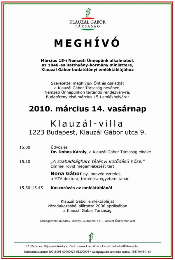 Szeretettel meghívjuk Önt és családját a március 15-i Nemzeti Ünnepünk alkalmából tartandó megemlékezésünkre, Budatétény első március 15-i emlékhelyéhez, az 1848-as Batthyány-kormány minisztere, Klauzál Gábor budatétényi emléktáblájához: 2010. március 14-én, vasárnap 15 órakor.