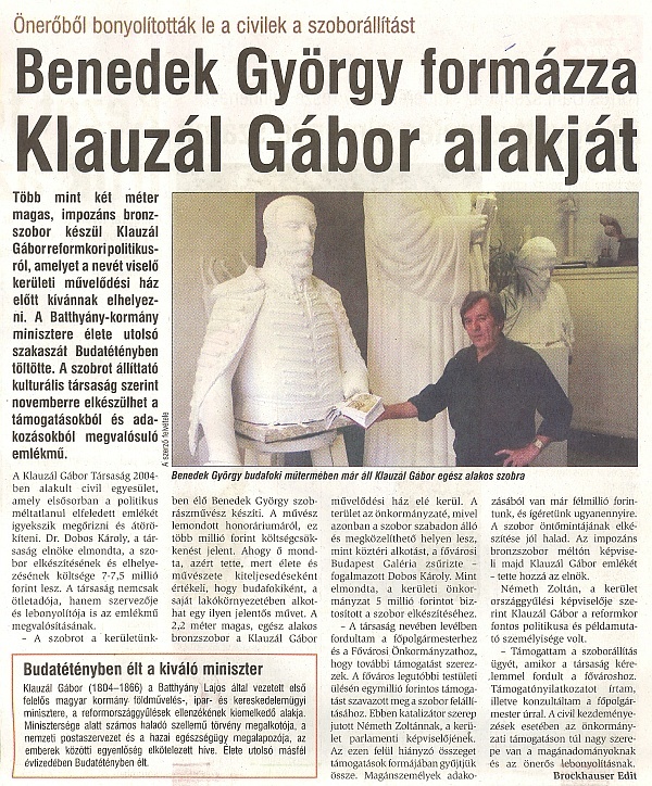 A Helyi Téma - Budapesti Téma XXII. kerületi blokkjában 2011. szeptember 7-én megjelent híradás beszámol a Klauzál-szobor életre-hívásának hátteréről, bemutatja a készülő alkotást a művész műtermében