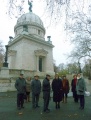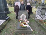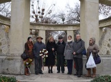 A rövid kitérő után, a temető főbejáratától – ahol csatlakozott hozzánk Somodi Anett, a Budapesti Városvédő Egyesület titkára és Hódi Szabolcs a Klauzál Gábor Társaság titkára, valamint annak tagja Géczi Gábor is – indultunk gyalogosan megemlékezésünk helyszínére. Séta közben Bartos Mihály szólt a temető történetéről és mesélt azokról a sírokról, neves személyiségekről, kiknek emlékei előtt elhaladtunk. Az állami tulajdonban és műemléki védelem alatt álló, mindannyiunkat elborzasztó állapotban lévő árkádsor között, Alpár Ignácz pusztulóban lévő síremlékét is magunk mögött hagyva érkeztünk el a XIX. századi magyar romantikus irodalom hallhatatlan alakja, Jókai Mór sírjához. Innen – immáron a síremlék történetének ismeretében –, Ady Endre és Blaha Lujza emlékének is búcsút intve folytattunk tovább utunkat. Már messziről Munkácsy Mihály monumentumára függesztettük tekintetünket, hogy ne kelljen útközben neves eleink hamvai fölé emelt, siralmas, elhanyagolt állapotban lévő köveken szomorkodnunk, avagy a folyamatosan szaporodó, csupán pénz kérdése alapján létesülő, a Nemzeti Sírkert arculatát romboló sírjeleken bosszankodnunk. Utunk végén, a 34/2-es ú.n. Művész-parcellában, az 1. sor 47. számú sírhelynél, Henszlmann Imre síremléke előtt álltunk. Itt csatlakozott hozzánk még a Klauzál Gábor Társaságtól Örsi Gabriella és a két oldalági Henszlmann-leszármazott, Henszelmann István és Henszelmann Imre is.