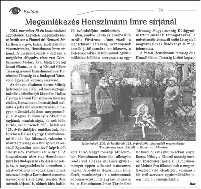 „Minden nemzet, mely elmúlt kora emlékezetét semmivé teszi, vagy semmivé lenni hagyja, saját nemzeti életét gyilkolja meg.” - írja Kölcsey Ferenc. A kassai Henszlmann Imre Történelmi Társaság, a Klauzál Gábor Társaság és a Budapesti Városvédő Egyesület 2013. november 25-én a Fiumei úti Nemzeti Sírkertben, közös kegyeleti megemlékezést tartott, hogy néhai Henszlmann Imre alakja és nemzetünk érdekében végzett munkássága a hálátlan utókor tudatlan közönye miatt, ne vesszen véglegesen a feledés homályába...