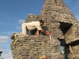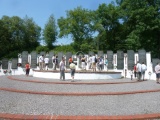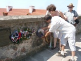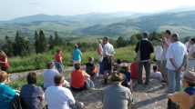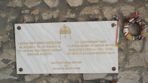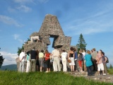 Felsőgerebent magunk mögé hagyva, nem túl jó minőségű úton, felkapaszkodtunk autóbuszunkkal a 841 méter magas Vereckei-hágóra. A honfoglaló magyar törzsek Árpád vezetésével itt érkeztek meg a Kárpát-medencébe. Ezen a Magyarország történelmében kivételes jelentőségű helyen 1896-ban az 1000 éves évfordulón állítottak először emlékoszlopot. A Trianon utáni időkben az oszlopot sorsára hagyták, feliratait eltávolították, s bár 1939-ben felújították, 1975-ben végleg lebontásra került. 1996-ban Matl Péter új emlékművet alkotott, de az ukrán tiltakozások miatt felavatása csak 2008-ban történt meg, sajnos azóta is többször érték rongálások. A művész hét tömbből álló kaput állított, a hét honfoglaló törzset szimbolizálva. Az emlékmű a hágó tetejétől, az eredeti helyszíntől néhány száz méterre áll, az utolsó szakaszon gyalog közelítettük meg, gyönyörű kilátás nyílik innen a környező hegyvonulatokra. Ideképzeltük Feszty Árpád körképét, s bár ő a mai ismeretek szerint Munkács környékén, Kendereske falu határában festette a képet, azért magunk előtt láttuk bevonuló őseinket. Koszorúnkat nem az emlékmű aljára, hanem kissé magasabbra próbáltuk helyezni, Lükő Szabolcs segítségével ez sikerült is, bár koszorúzási menete nem számított szokványosnak. A Himnusz és a Szózat eléneklése tette ünnepélyessé az itt töltött perceket. /Igaz, Györök Natália megjegyzése szerint éneklésünk olyan volt, mint általában a KGT ülések, azaz a szívünk és lelkesedésünk nem hiányzott, rendezettségünk és egységünk annál inkább. /