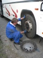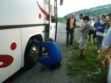 Lefelé gyalogolva a hágó pontos jelentését próbáltuk többen is meghatározni, mivel ez a hágó nem olyan, mint az általában ismertek, inkább lapos, hosszan elterülő hegygerinc. Végül a földrajz tudományában szakértő idegenvezetőnktől kértünk segítséget. Visszaindultunk a szerpentinen autóbuszunkkal, már túljutottunk a nagy kanyarokon, de még nem értük el Alsóvereckénél a fő utat, amikor a busz jobb első kereke defektet kapott. Leszálltunk, sofőrünk nyomban munkához látott. Egy kisebb csapat gyalogosan elindult, néhányan segíteni próbáltak vagy csak szemlélődtek. Ilyen nagy busz kerékcserét sokan még nem láttak közülünk. / Lehet, hogy legközelebb egy autóbuszszervizbe kellene kirándulnunk, hiszen néhányan – bár ez nem túl hízelgő a szervezőkre és Kárpátaljára nézve - ezt a kerékcserét tartották a kirándulás egyik legnagyobb élményének. /