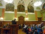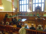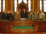 A program első állomásaként a Fővárosi Törvényszék Könyvtárát tekintettük meg. Kovácsné Garamszegi Marianna vezető könyvtáros röviden bemutatta nekünk a könyvtár működését, szolgáltatásait, elérhető adatbázisait (több mint 30.000 kötet), majd a könyvtár olvasótermében megtekintettük a vitrinekben kiállított régi könyvek gyűjteményét, így többek között a Werbőczy-féle Magyar Törvénytár – Nemes Magyarország – Hármas Törvénykönyvének 1830. évi példányát, az 1832-36-os pozsonyi rendi országgyűlés Törvény Czikkelyeit (Articuli Comitiorum), az 1899-es Söradó Törvény és Szabályok hivatalos összeállítását. Egy külön pulpituson belelapozhattunk a Fővárosi Törvényszék 1873-as teljes személyi állományát megörökítő fényképalbumba, melyet munkássága jutalmául 1876-ban Lipót-rend lovagkeresztjével kitüntetett méltóságos Sárkány József (1828-1903) úrnak, a pesti királyi törvényszék elnökének (1872-75) adományozott a pesti királyi törvényszék járásbíróságának és a királyi ügyészség összes dolgozója.