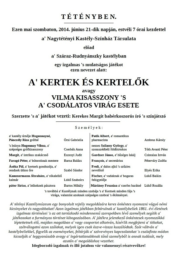 A Klauzál Gábor Társaság féltucatnyi tagja működik közre a játékban, szeretettel várjuk mis is a játékos kedvű érdeklődőket!