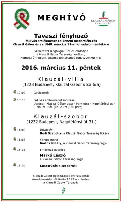 Szeretettel meghívjuk Önt és családját az 1848. március 15-ei forradalom és szabadságharc emlékére megtartandó fáklyás emlékmenetünkre (a Klauzál-villától a Klauzál-szoborig) és ünnepi megemlékezésünkre (a Klauzál-szobornál): 2016. március 11-én, péntek 17 ill. 18 órától.