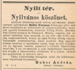 - 1881 novemberében Huber András promontori műhelyében tetemes kárt okozó betörés tetteseit orgazdástól villámgyorsan kézre kerítő csendbiztos „erélyes eljárását” elismerendő, a bűnelkövetőket egytől-egyik nevesítő nyilvános köszönetet tett közzé A hon c. folyóirat 1882 januári száma Nyílt tér rovatában…