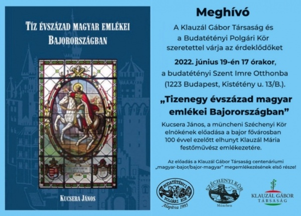 Bajorország magyar vonatkozású emlékhelyeit kutató Kucsera János, a müncheni alapítású Széchenyi Kör elnökének előadására – 2022. június 19-én 17 órakor a budatétényi Szent Imre Otthonban – a bajor fővárosban 100 évvel ezelőtt elhunyt Klauzál Mária festőművészre emlékezésünk centenáriumi „magyar-bajor/bajor-magyar” programpárunk első része