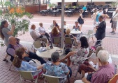 Miután készítettünk egy csoportképet az iskola bejárata előtt elindultunk utunk következő állomására Szegedre, ahová a tervezettekhez képest hamarabb érkeztünk. A Kis Virág(h) cukrászda teraszán már vártak minket a Szegedi Közéleti Kávéház tagjai, csatlakoztunk hozzájuk fagyi és limonádé fogyasztása mellett beszélgettünk, majd meghallgattuk dr. Nagy Péter, Társaságunk tiszteletbeli tagjának beszédét „A rejtélyes emléktábla” címmel. Ezt követően Kecskeméti Tibor és Szondi Ildikó elhelyezték a cukrászda épületében lévő emléktáblánál az emlékezet virágait.