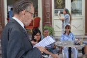 Ezután visszasétáltunk a Szabó-Simig házhoz, ahol Hódi Szabolcs felelevenítette Klauzál Gábor utolsó napjainak történetét, majd Zsidákovitsné Máriával elhelyeztük az épület falán lévő emléktáblánál az emlékezés koszorúját.