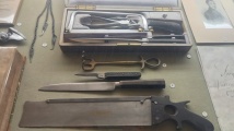 leharcolt láncfűrésze, sebészkésének üres tokja (csak remélni tudjuk, hogy a szike