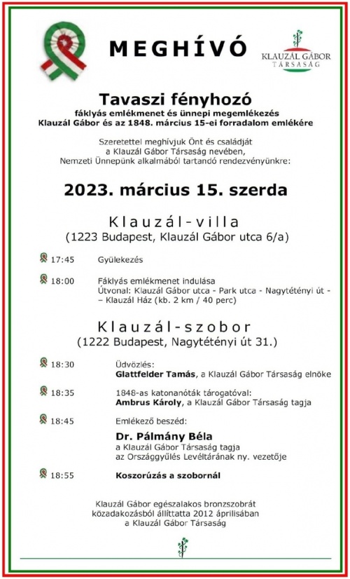 Szeretettel meghívjuk Önt és családját az 1848. március 15-i forradalom és szabadságharc emlékére megtartandó fáklyás emlékmenetünkre (a Klauzál-villától a Klauzál-szoborig) és ünnepi megemlékezésünkre (a Klauzál-szobornál): 2023. március 15-én, pénteken 18:00 illetve 18:30 órától.
