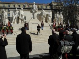 A Himnusz és a Szózat közös éneklése a szépen fúvó Honvéd Zenekarral zárta ünnepélyes keretbe a mintegy negyven perces megemlékezést. Hende Csaba az országgyűlés alelnöke, a törvényelőkészítő bizottság elnöke szólt először, méltatva az áprilisi törvények máig ható erejét, aztán a pesterzsébeti Kossuth Lajos Gimnázium egykori diákja idézte fel ékesszólóan Kossuth 1848. április 11-én Pozsonyban elmondott beszédét az utolsó rendi országgyűlésen, V. Ferdinánd királynál elért eredményekről. Egy nyugdíjas dalkör negyvennyolcas dalokat énekelt, aztán jött Csorba László, majd egy újabb Kossuthos diák, ezúttal Batthyány Lajos üdvözlőbeszédével, végül a hivatalos koszorúzók. Tiborral ezt követően Klauzál lábaihoz elhelyeztük a Klauzál Gábor Társaság koszorúját.