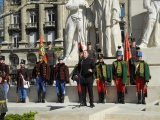 verőfényes napon a Kossuth téren, a Kossuth-szoborcsoport előtt. Az áprilisi