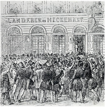 Márciusi ifjak a Landerer és Heckenast nyomda elött 1848. március 15-én (Vincenz Katzler (1823-1882) körajza, a kassai Képes Újság 1848. március 25-i elsö számából)