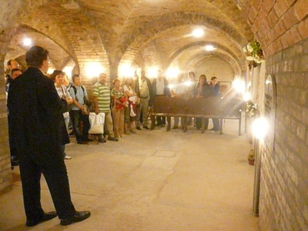 Kalauzunk a Fogadalmi temlom altemplomának sírjai között Nyári Imre