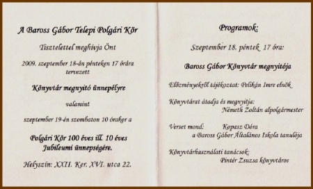 A Baross Gábor Telepi Polgári Kör kettős ünnepének jubileumi meghívója
