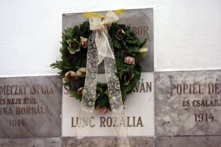 A megemlékezés koszorúja a kápolna mecénásának emléktábláján