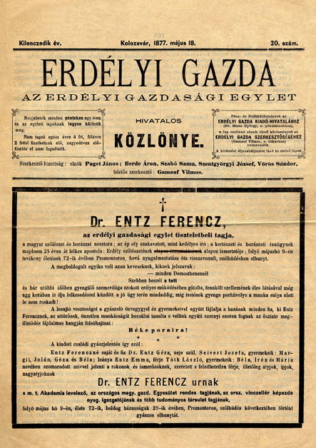 Gyászjelentése az Erdélyi Gazda című lapban (1877)