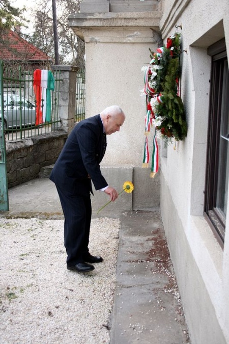 Hajas Ervin volt polgármester, a megemlékezés virágjával