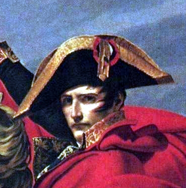 Napóleon, fején a háromszínű kokárdával (szalagrózsával) díszített háromszögletű csákó