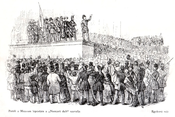 Petőfi a Múzeum lépcsőjén a Nemzeti dalt szavalja