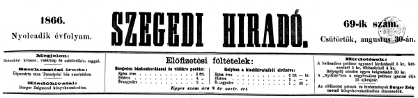 A Szegedi Híradó 1866. augusztus 30-ai fejléce