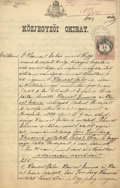A tétényi birtok eladásának közjegyzői okirata (1. oldal, 1889.)
