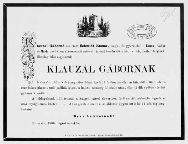 Klauzál Gábor családi gyászjelentése (1866)