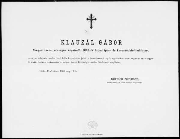 Klauzál Gábor székesfehérvári gyászmiséjének hirdetménye (1866)