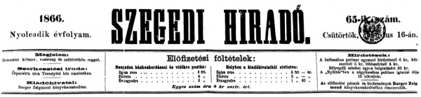 Szegedi Híradó 1866. augusztus 16-ai lapszámának fejléce