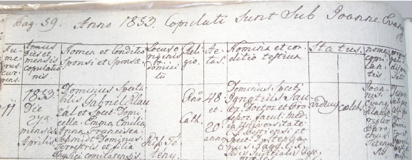 Klauzál Gábor és Schmidt Emma 1853. április 27-i házassági anyakönyvi bejegyzése
