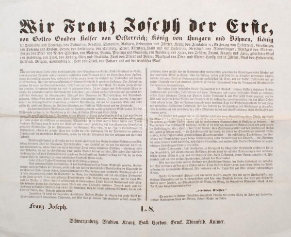 1849. március 4. Olmütz, Az I. Ferenc József(1848-1916) által kiadott oktrojált alkotmány német nyelvű kiáltványa