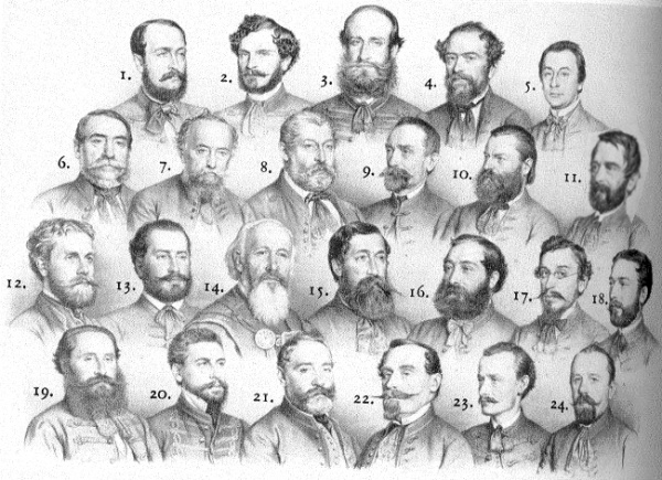 1.Csengery Antal 2.Andrássy Gyula 3.Podmaniczky Frigyes 4.Kazinczy Gábor 5.Jámbor Pál 6.Klauzál Gábor 7.Kubinyi Ferenc 8.Szentiványi Károly 9.Ürményi József 10.Kubinyi Rudolf 11.Zsarnay Imre 12.Keglevich Béla 13.Odescalchi Gyula 14.Illéssy János 15.Hajnik Pál 16.Szelestey László 17.Horváth Boldizsár 18.Bárczay Ödön 19.Beniczky Ödön 20.Csáky Tivadar 21.Tanárky Gedeon 22.Ráday Gedeon 23.Ürményi Miksa 24.Kiss Miklós