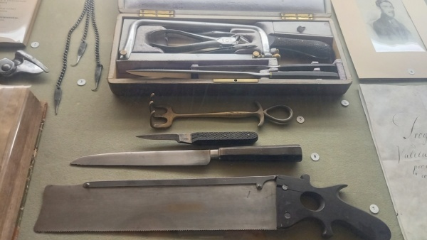 Bonctani eszköztár, csontfürész, bonctani kések, bonctani horgok