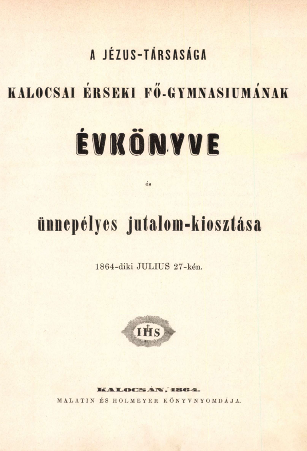 Beszámoló Klauzál Gábor 1864-es, kalocsai fögimnáziumbeli látogatásáról. Kép forrása: Évkönyv 1863/64, címlap