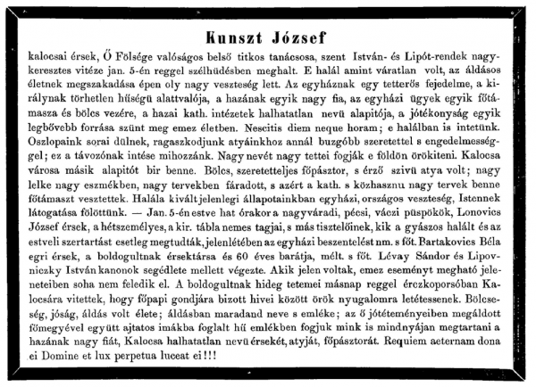 Híradás Kunszt érsek haláláról.