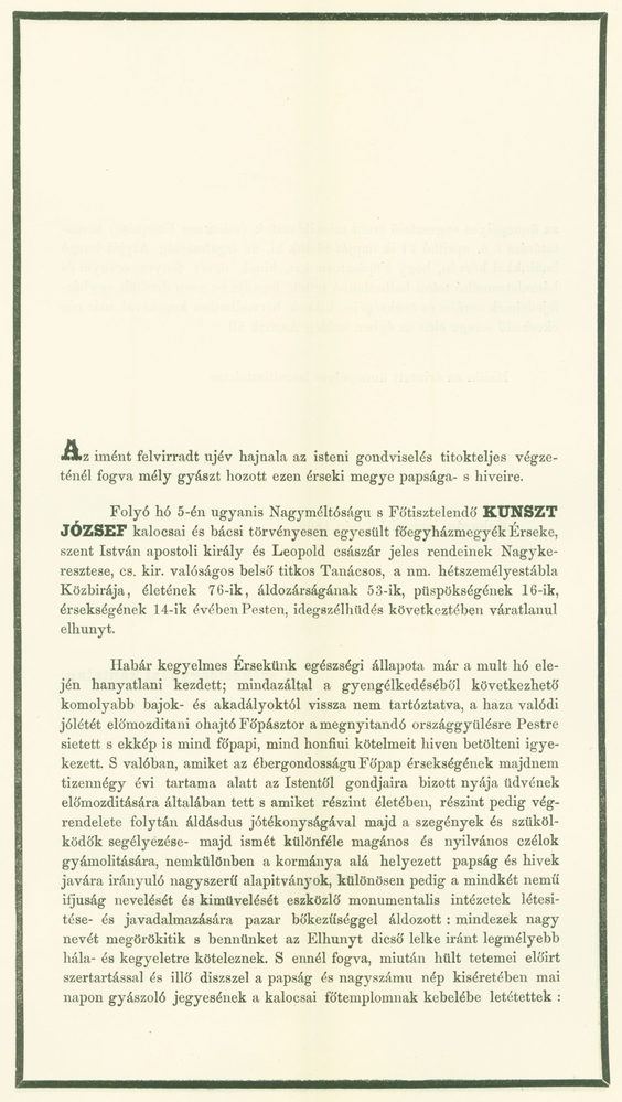 A kalocsai káptalan magyar nyelvű közleménye Kunszt József érsek temetéséről és a később tartandó gyászszertartásról.