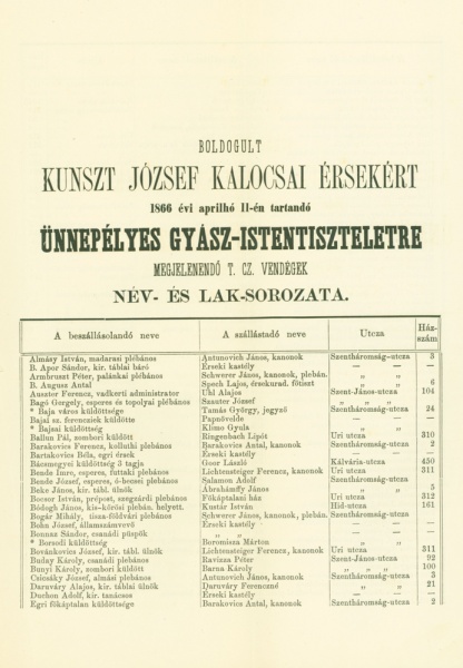Kunszt érsek 1866. április 11-i gyászszertartásán megjelent vendégek és szállásadóik névsora, 1. oldal