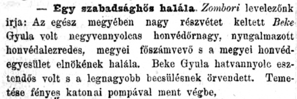Beke Gyula honvéd őrnagy gyászértesítője